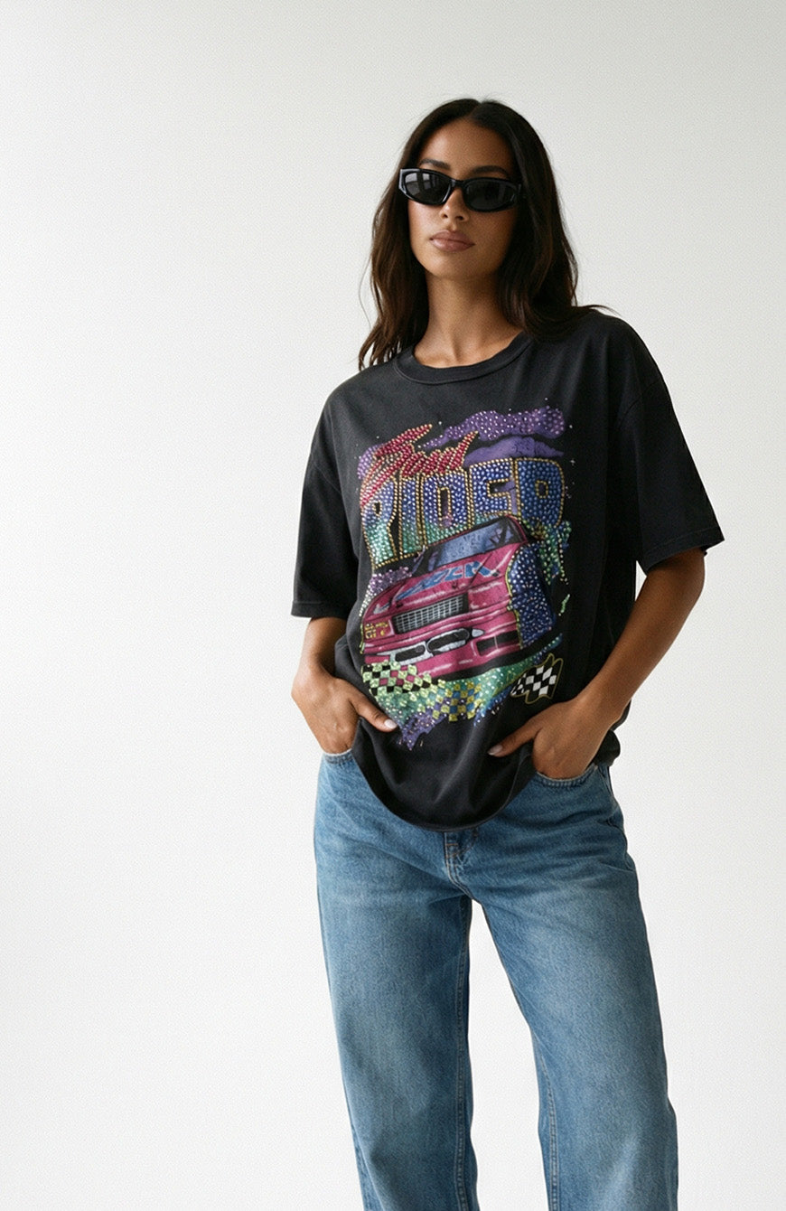 Effortlessly essential, this vintage-inspired tee features race car vintage inspired graphic embellished with high quality crystals for added dimension.