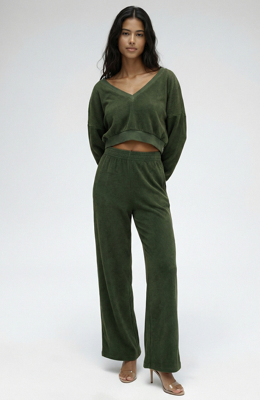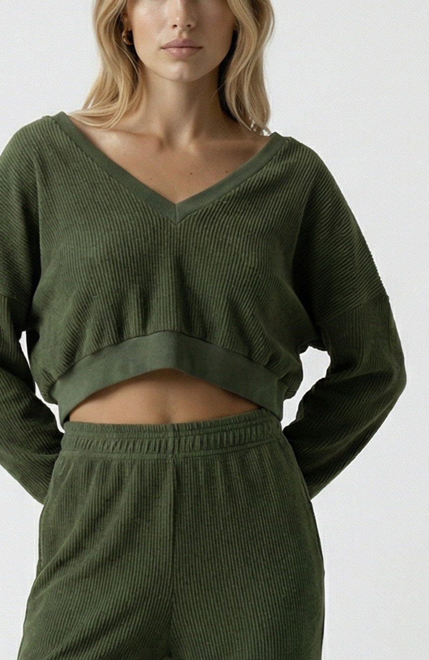 This pullover has a deep V-neck design that exudes an effortlessly chic and modern look. The daring plunge of the neckline adds a touch of sensuality to your outfit.The deep V-neck is a flattering choice for all body types, elongating the neck and creating an alluring silhouette. Crafted from corded terry fabric. The texture is both unique and visually appealing, offering a touchable, three-dimensional quality that sets it apart from standard knitwear. Corded terry fabric provides a cozy, plush feel against the skin while maintaining breathability. This garment is finished w/ a hand dyed process that gives the fabric an ultra soft feel and unique look.
