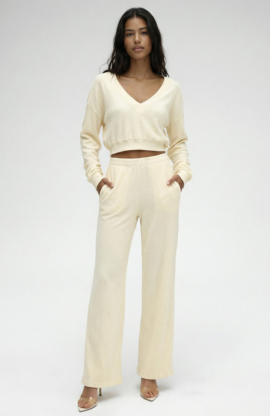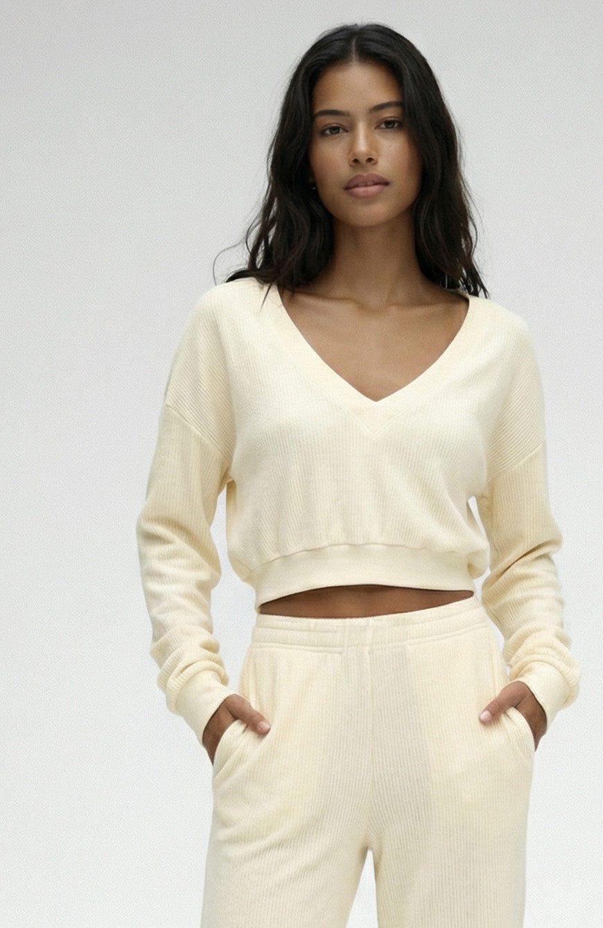 This pullover has a deep V-neck design that exudes an effortlessly chic and modern look. The daring plunge of the neckline adds a touch of sensuality to your outfit.The deep V-neck is a flattering choice for all body types, elongating the neck and creating an alluring silhouette. Crafted from corded terry fabric. The texture is both unique and visually appealing, offering a touchable, three-dimensional quality that sets it apart from standard knitwear. Corded terry fabric provides a cozy, plush feel against the skin while maintaining breathability. This garment is finished w/ a hand dyed process that gives the fabric an ultra soft feel and unique look.